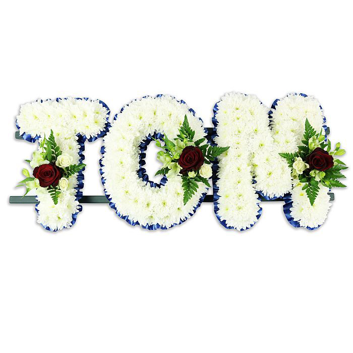Approximate dimensions: Length 90 cm (35"), Width 33 cm (13"), Height 20 cm (8"). This TOM letter tribute is ideal for funerals, memorials, and cremation services, offering a personal way to say goodbye. Designed with care by our skilled florists in Kenton, it can be delivered directly to local funeral directors or a family address.