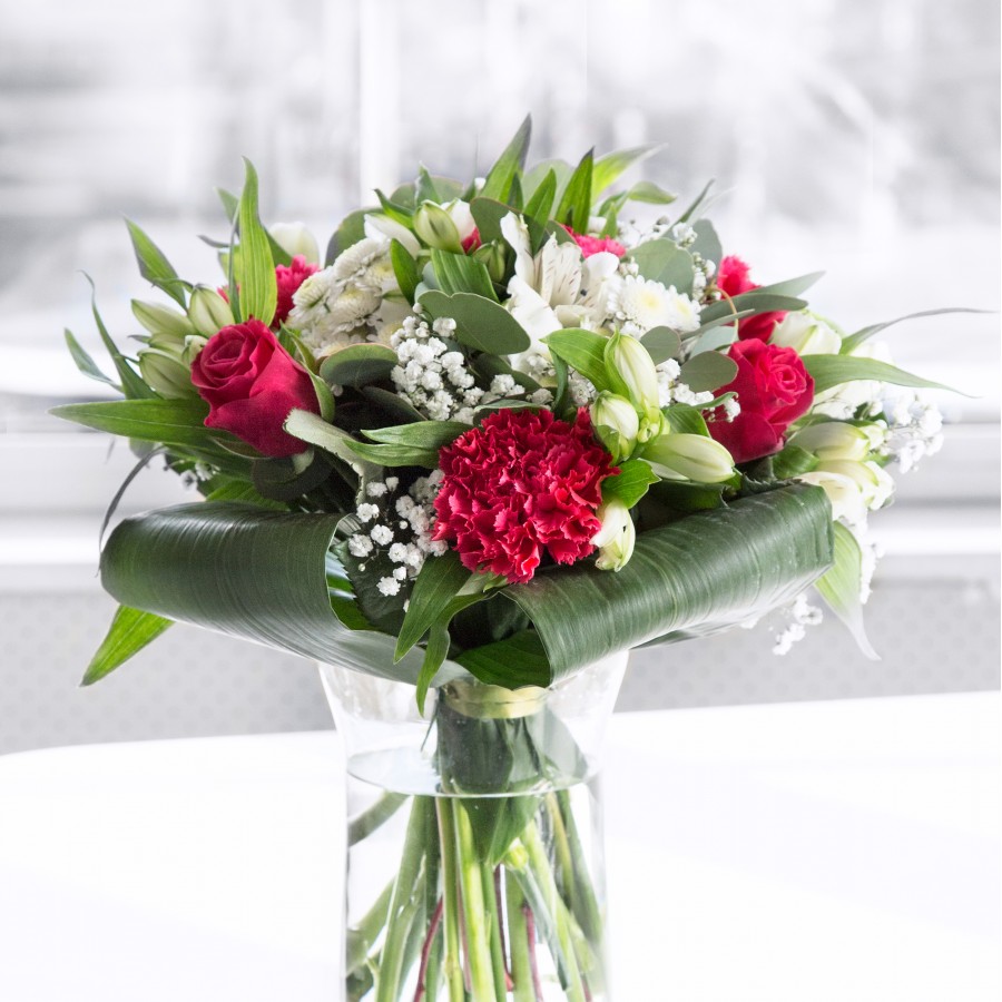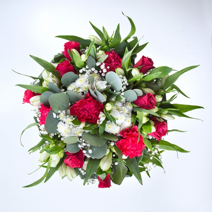 Embrace the graceful beauty of our floral arrangement, combining sweet white chrysanthemums and gypsophila with vibrant red roses and carnations. The elegant design is finished with white alstroemeria and aspidistra leaves, creating a harmonious and stunning bouquet.