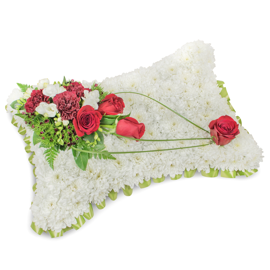 Honor your loved ones with our beautifully arranged sympathy bouquet, showcasing white chrysanthemums, red roses, white freesias, and dark red carnations. Each bloom is hand-selected to ensure freshness and arranged with dianthus and bear grass for a unique and heartfelt design.